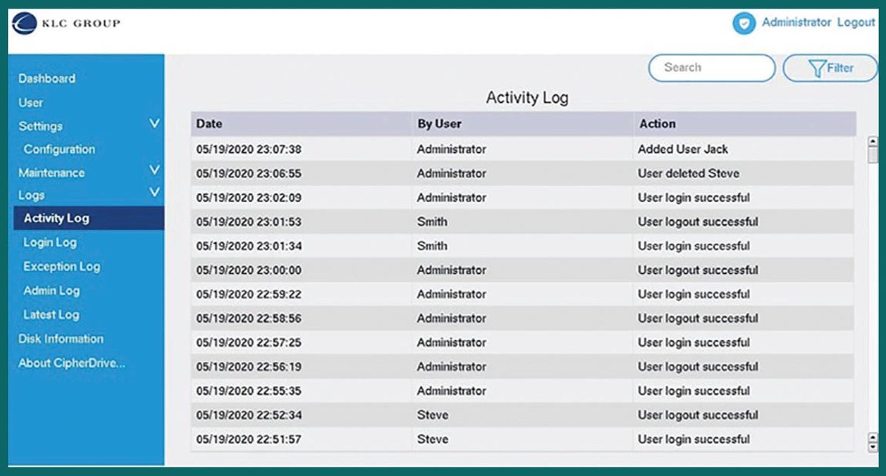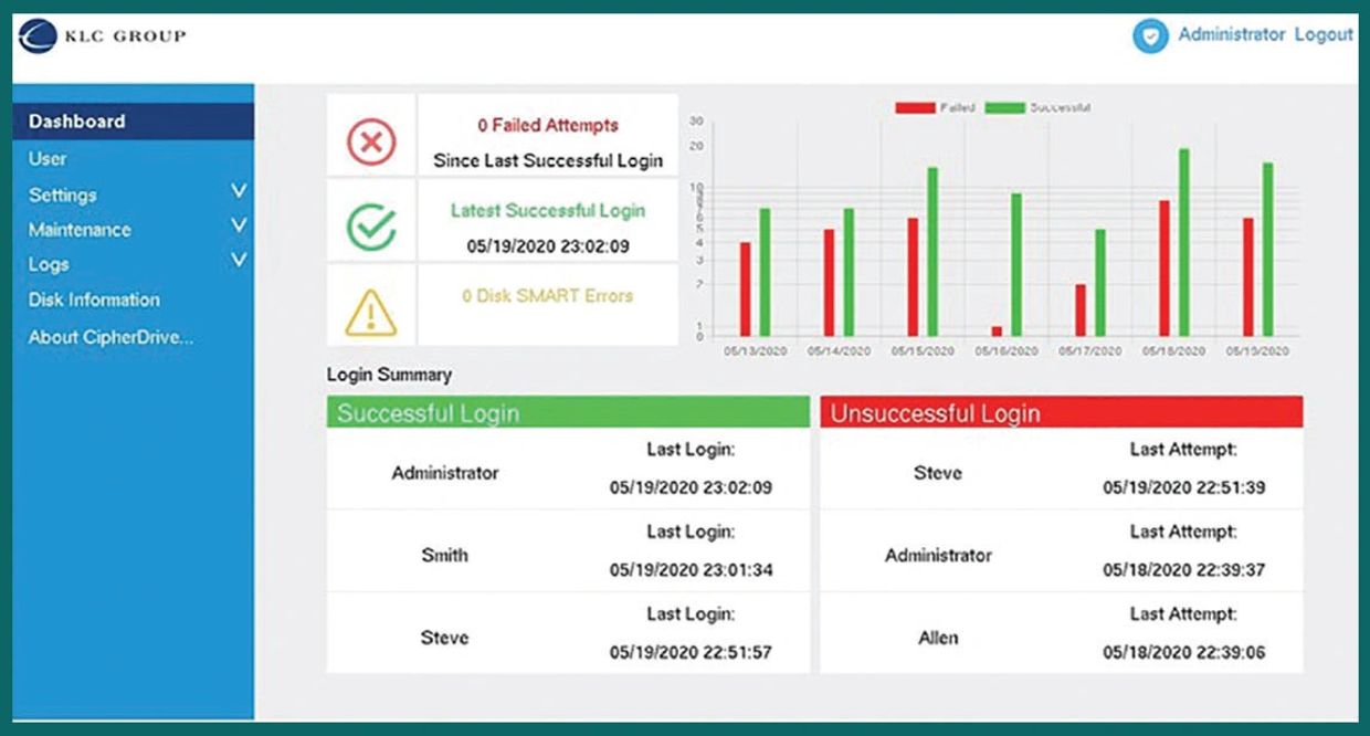 CipherDriveOne offers a number logging functions. With 5 detailed logging types, administrators can review the security profile of the computer and mitigate unauthorized access.