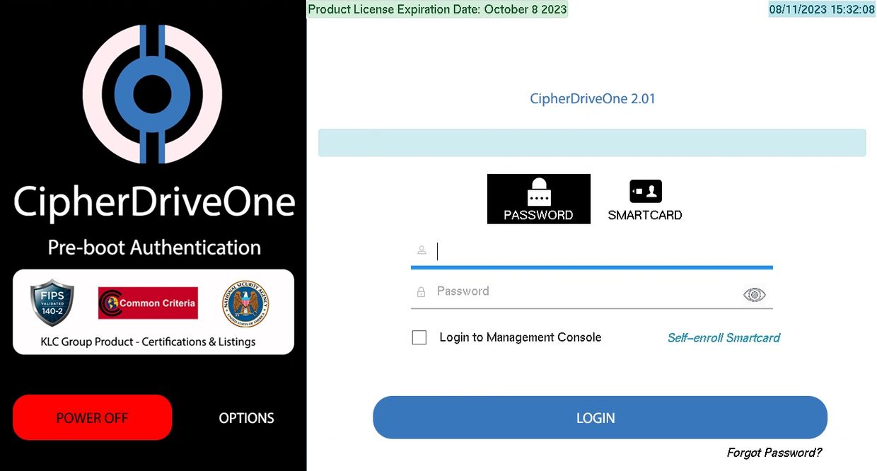 CipherDriveOne is a pre-boot authentication software. CipherDriveOne is installed on the shadow partition of the OPAL 2.0 hard drive where it is installed. Once the computer user turns on the machine, CipherDriveOne prompts the user for authentication (password or smartcard). Once authenticated, CipherDriveOne passes the proper encryption keys to unlock the operating system.